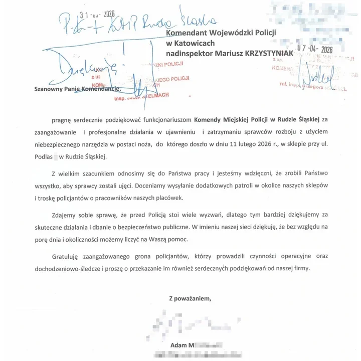 Do Komendanta Wojewódzkiego Policji w Katowicach nadinsp. Mariusza Krzystyniaka trafiły później podziękowania od przedstawicieli firmy. W piśmie podkreślono profesjonalizm policjantów, ich zaangażowanie i sprawne działanie po zdarzeniu.