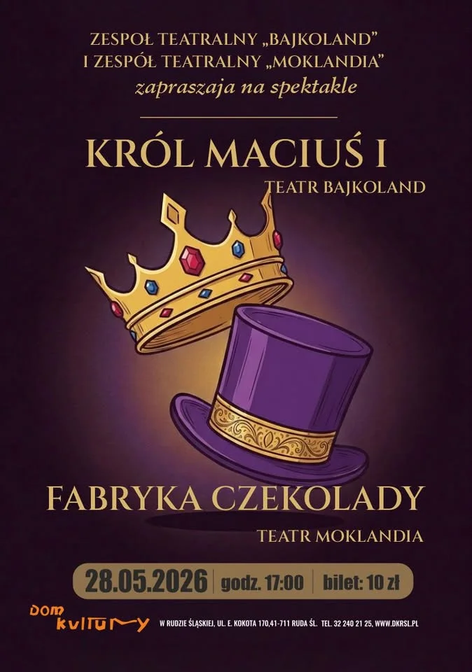„Król Maciuś I” i „Fabryka czekolady” w Rudzie Śląskiej – spektakle Teatru Bajkoland i Teatru Moklandia