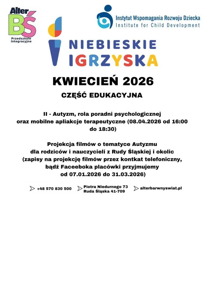 - 8 kwietnia 2026, godz. 16:00–18:30 — „Autyzm, rola poradni psychologicznej oraz mobilne aplikacje terapeutyczne”