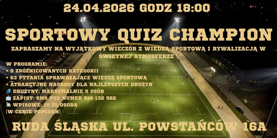 W Rudzie Śląskiej szykuje się wieczór, w którym sportowa wiedza będzie sprawdzana bez litości SPORTOWY QUIZ CHAMPION w Champion Pub to propozycja dla tych, którzy kojarzą składy, wyniki i ciekawostki z różnych dyscyplin, ale też dla ekip, które po prostu lubią dobrą zabawę. Na uczestników czekają pytania, nagrody i sporo okazji do wspólnego kibicowania własnym odpowiedziom. Warto zebrać ekipę i spróbować swoich sił.
