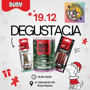 - Świąteczna degustacja przysmaków i mokrej karmy — produkty BUBA do testowania na miejscu.